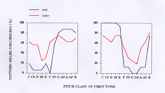 As expected from previous findings, the mothers perceived the tritone paradox in ways that were strikingly different from each other. Remarkably, although all the subjects were Californian, their perceptions corresponded closely to those of their mothers, and so also differed considerably from each other.