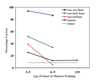 The figure below shows, for each group and subgroup, the average percentage correct on our test for absolute pitch. The line labeled chance represents chance performance on the test. We can see that, within each group, those subjects who had begun musical training at ages 2-5 scored higher than those who had begun training at ages 6-9. However, there was also an overwhelmingly strong effect of tone language fluency, holding ethnicity constant. Those subjects who spoke a tone language very fluently showed remarkably high performance on the test, with an overall performance of over 90%. Indeed, their performance was far higher than that of the Caucasian nontone language speakers, and importantly it was also far higher than for the subjects of East Asian ethnicity who did not speak a tone language fluently; i.e., the tone nonfluent group. And it was also higher than that of the tone fairly fluent speakers, which was in turn higher than that of the tone nonfluent speakers, and of the nontone language speakers.