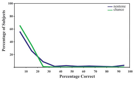 The strong relationship between the prevalence of absolute pitch and fluency in speaking a tone language is also reflected in the figures below. The first figure shows the relative distribution of scores of all the nontone language speakers in the study, together with the hypothetical distribution of scores expected from chance performance. Notice the striking similarity between these two plots, with a very slight increase in the prevalence of absolute pitch in the 90-100% region.