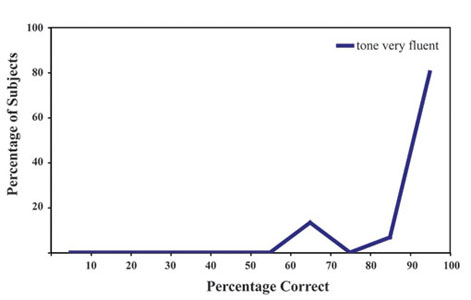 The second figure shows, in contrast, the relative distribution of scores in the tone very fluent group. As we can see, the performance of most of these subjects was in the 90-100% region. So this difference between the groups is very striking.